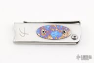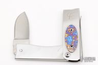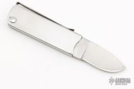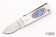 This Mini Tri-Folder by Fred Perrin features a satin finished blade. The handle is two pieces of stainless steel the blade folds into, has an integral clip, anodized titanium overlay. Comes with a black leather slip sheath. New from maker.