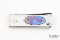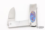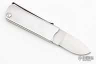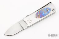 This Mini Tri-Folder by Fred Perrin features a satin finished blade. The handle is two pieces of stainless steel the the blade folds into, has an integral clip, anodized titanium overlay. Comes with a black leather slip sheath. New from maker.