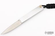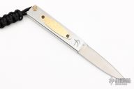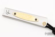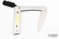 This Tri-Folder by Fred Perrin features a satin finished blade. The handle is two pieces of stainless steel the the blade folds into, textured brass overlay. Comes with a black leather slip sheath. New from maker.