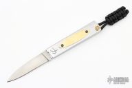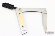 This Tri-Folder by Fred Perrin features a satin finished blade. The handle is two pieces of stainless steel the the blade folds into, textured brass overlay. Comes with a black leather slip sheath. New from maker.