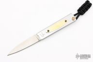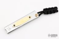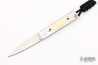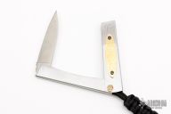 This Tri-Folder by Fred Perrin features a satin finished blade. The handle is two pieces of stainless steel the the blade folds into, textured brass overlay. Comes with a black leather slip sheath. New from maker.