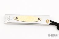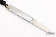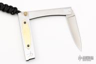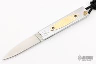 This Tri-Folder by Fred Perrin features a satin finished blade. The handle is two pieces of stainless steel the the blade folds into, textured brass overlay. Comes with a black leather slip sheath. New from maker.