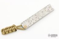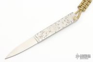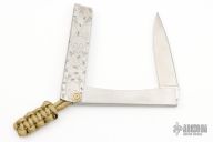This Tri-Folder by Fred Perrin features a satin finished blade. The handle is two pieces of stainless steel the the blade folds into, laser engraved. Comes with a black leather slip sheath. New from maker.