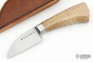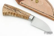 This Integral Sheepsfoot by Matt Behnke features a hand rub satin finished blade with integral bolster, .126" blade stock and 1.110" blade depth, hidden tang construction. The handle has stabilized spalted maple grip. Comes with a brown leather sheath with Ulti-Clip, and a zippered case. New from maker.