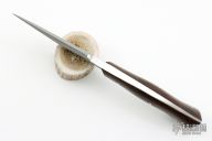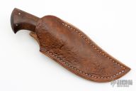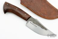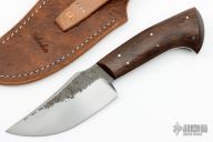 This Hunter by Matt Behnke features a hand rub satin finished blade with forge finished flats, .262" blade stock and 1.628" blade depth, full tapered tang construction. The handle has Birdseye Koa scales with stainless pins. Comes with a brown leather sheath and a zippered case. New from maker.