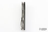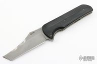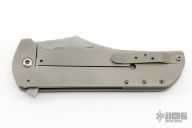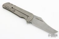 This Reno by Mikkel Willumsen features a tumbled tanto blade with notched thumbrest and double a-symetrical swedges and beveled blade spine. 0.162" blade stock. The handle has a black G-10 scale, bead blasted titanium liner and lockside, matching tip up titanium clip. Nice detent, lockup and blade seating. Comes with leather zippered case. Excellent condition.