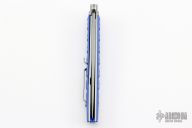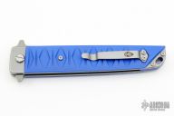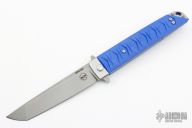 This knife features a stonwashed tanto D2 blade. The handle features blue G-10 scales over steel liners with a matching tip up pocket clip. Includes the original box and a padded zippered case. Excellent Condition.