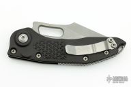 This Stitch Auto by Microtech Knives features an Apocalyptic finished blade and false top edge, notched thumb and finger rests. The handle has a black anodized and milled aluminum handle with a bead blasted titanium backspacer and a bead blasted stainless steel clip, tip up carry, lanyard hole at the butt. Comes with original box. S/N of 0908 and dated 04/2017. Excellent condition.