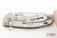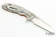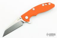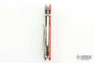 This XM-18 by Rick Hinderer features a stone wash finished blade with notched thumbrest and flipper. The handle has an anodize finish titanium frame, orange G-10 scale, tip up or down reversible titanium clip and filler tab. Comes with original box, papers and extra hardware. Excellent condition.