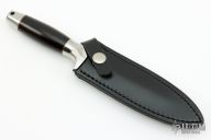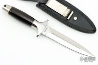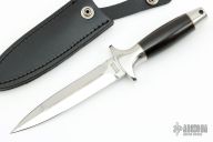 This Trooper by Kershaw Knives is a mirror polished double-edged dagger with fullers, .222" blade stock and .943" blade depth, hidden tang construction. The handle has a stainless steel guard and butt with wood grip and brass spacers, lanyard hole at the butt. Comes with a black leather sheath, original box and papers dated August 1979 and S/N 1519.  Excellent Condition.