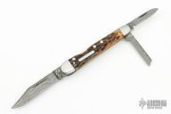 This Case/Bose yearly knife features three Damascus blades with nail nicks, the main blade is a lockback, the two smaller blades are both slipjoints with halfstops. The handle has stainless steel bolsters and cap, bone covers, stainless steel liners and back springs. Comes with a leather zippered case, box and papers.  Only 100 ever made.  Excellent condition.