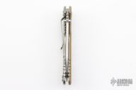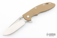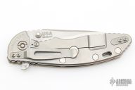 This Skinny XM-18 3.5" flipper by Rick Hinderer features a stonewashed blade with notched thumbrest and flipper. The handle has a stonewashed titanium frame with a Coyote G-10 scale, a tip up or down reversible titanium clip and filler tab, lanyard hole at the butt. New condition. Comes with original box and extra hardware.