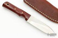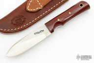This Model 10 Salt Fisherman and Household Utility features a satin finished upswept blade with swedge and notched thumbrest, .103" blade stock and .842" blade depth. The handle has red linen micarta scales with brass pins over full tang construction. Brass lanyard tube with lanyard in pommel. Includes a brown leather sheath. Excellent condition.