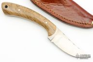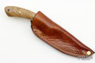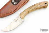 This skinner by Lynn Dawson features a satin finished blade with notched thumbrest and fileworked spine, .131" blade stock and 1.042" blade depth, full tang construction. The handle has wood scales with stainless pins and lanyard hole. Comes with a brown sheath. Excellent condition.
