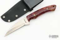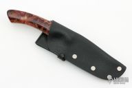 This custom knife by John Roy features a satin finished blade with notched thumbrest and fileworked spine, .136" blade stock and .908" blade depth, full tang construction. The handle has stabilized burl wood scales with mosaic pins and lanyard hole. Comes with a kydex sheath. Excellent condition.