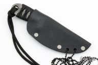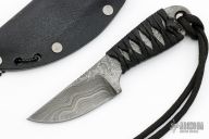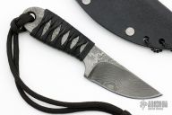 This neck knife by Lynn Dawson features a Damascus blade with notched thumbrest, .214" blade stock and .982" blade depth, full tang construction. The handle has epoxied cord wrap. Comes with a kydex neck sheath. Excellent condition.