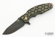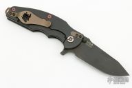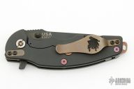 This Jurassic by Hinderer Knives features a black clip point blade with notched thumbrest and flipper. The handle has a black titanium frame with a green/black G-10 scale, tip up or down reversible clip and a modular backspacer. Nice detent, lockup and blade seating. Teflon washers. Comes with original box. Has a couple light scuffs, excellent condition.