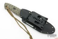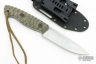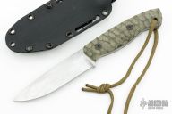 This Bushcraft knife is a collab between Fank Landau and Angryman Knives, it features a stonewashed blade with fileworked thumbrest, .158" blade stock and 1.158" blade depth, full tang construction. The handle has textured green linen micarta scales. Comes with a kydex sheath. New from maker.