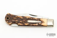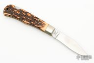 This "Tracker" bullet knife was the Remington Collector's Series Knife for 1990.This knife features a satin finished blade with a notched thumbrest and a single nail nick.  The handle has nickel silver bolsters, faux stag scales, brass liners and a stainless steel backspring.  Includes the original box and papers.  Excellent Condition.