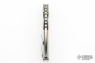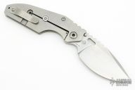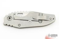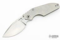 This XL Jibble by Mick Strider features a stonewashed blade with notched thumbrest and a thumbhole. The handle has a stonewashed titanium frame with tip up reversible clip. Nice detent, lockup and blade seating. New Condition.