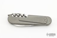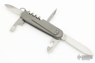 Building on the already formidable platform that is the Victorinox Spartan, which is a medium-sized SAK with a corkscrew and can opener with 12 different functions – the Daily Customs Super Tinker replaces the stock cellidor (i.e plastic) scales with solid 6AL4V titanium goodness, stonewashed for enhanced wear resistance.