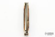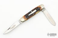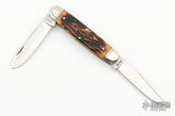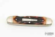 This Knife by Remmington has two satin finished blades with nail nicks. The handle has nickel silver bolsters, amber stag covers, brass liners and steel springs. Comes with original box. Excellent condition.