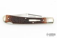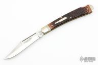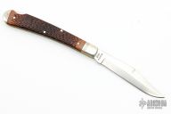 This knife features a satin finished blade with a single nail nick.  The handle has nickel silver bolsters, fo jigged bone scales, brass liners and a stainless steel backspring.  Includes the original box and papers.  Excellent Condition.