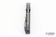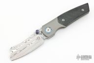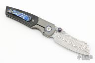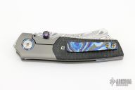 This Production Mini Barber by Berg Blades features a Damasteel blade with notched thumbrest and dual timascus thumbstuds. The handle has a stonewashed titanium frame with black micarta scales, Zircuti backspacer and tip up clip. Nice detent, lockup and blade seating. Has a couple light scuffs, otherwise excellent condition.