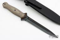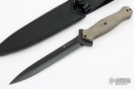The Steel Will Fervor 1201 is a tactical double-edged dagger. A striking feature of this knife is its symmetry. On the logo and the specifications on the blade are perfectly equal on both sides. The blade is made of Austrian Böhler N690Co steel, which is very well-known. The black ASPIS MIL-DTL-13924 military coating reflects does not reflect, which can be expected from a tactical knife. The micarta handle, made with 3D technique, provides plenty of grip and looks very nice. Micarta is a composite material made of canvas and resin. It even gives a lot of grip in wet conditions or when wearing gloves. The material is porous and may discolor by moisture or sweaty hands. This gives the knife a really unique look. Comes with original box and sheath. Excellent condition.