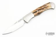 "I was born in North Dakota, but spent most of my youth in Illinois. I went west to attend college; and after graduating and a stint in the army, I returned to Utah State University to pursue a Master’s degree in biology. It was there in 1970 I began making knives as a hobby. It was difficult to get started back then, as there were no books on knifemaking and very few makers around to get advice from. I teamed up with Steve Mullin and we went north to see Bernard Sparks in Dingle, Idaho. Bernie was one of the original custom knifemakers and a founding member of the Guild. He pointed us in the right direction, showed us what a belt sander was, and we went back to Logan to construct one. For the next few years we made knives either full or part time depending on what other employment was available. In 1976 Steve and I bought adjoining pieces of land in North Idaho, built log homes on them and became professional knifemakers. Our first shop was built of logs. We eventually outgrew it and in 1983 I sold my half to Steve and built a shop of my own nearby where I work to this day."