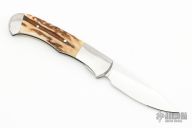This Custom Self Lock folding knife by Scott Sawby features a mirror polished blade with nail nick. The handle has dovetailed stainless steel bolsters with integral liners, has stag scales. Has some scratches, otherwise good condition.
