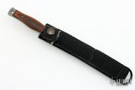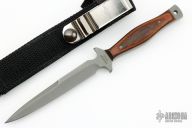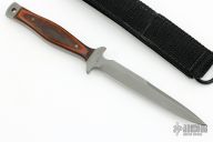 This dagger by Barry Dawson features a bead blasted blade with a false top edge, .250" blade stock and .647" blade depth, full tang construction. The handle has a wood scales, lanyard hole at the butt. Comes with a black nylon sheath and zippered case. Excellent condition.