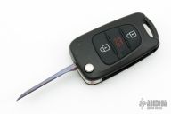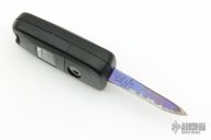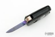 This Keyfob Auto by Warren Thomas features a chisel ground fingerprint anodized titanium blade with carbidized edge. It is made in the shape of a key and is installed into a side opening automatic keyfob. Excellent condition.