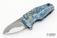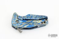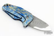 This Micro BOF (Bottle Opener Flipper) by GTC features a Chad Nichols Armor Core San Mai Damascus blade with bottle opener flipper. The handle is milled 3 alloy mokuti frame with matching backspacer and tip up clip. Nice detent, lockup and blade seating. Flips just like you would expect it to, perfectly. Comes with nylon zippered case and COA dated 2018. "Micro BOF 2018 Nichols" enscribed inside backspacer. Excellent condition.