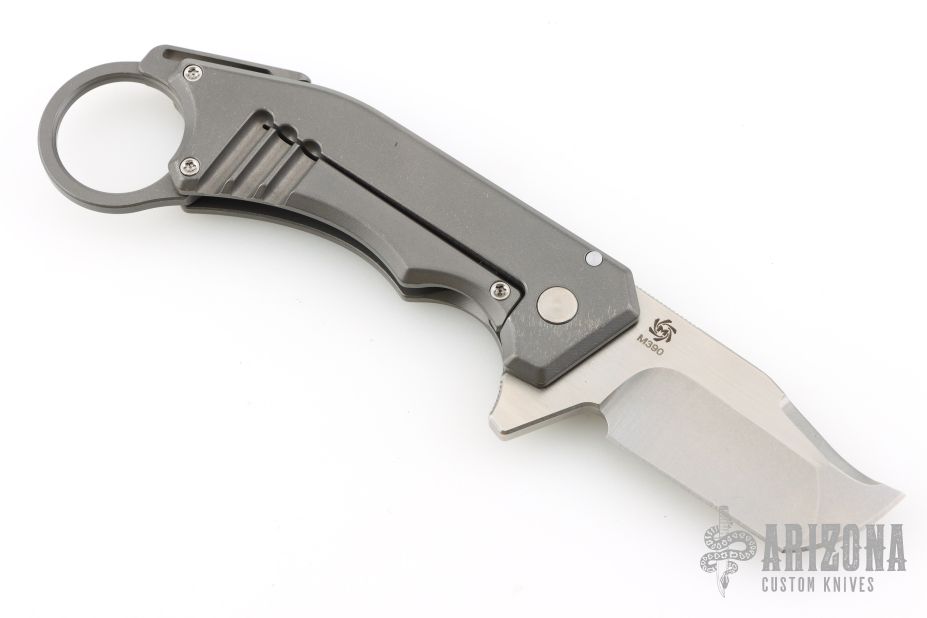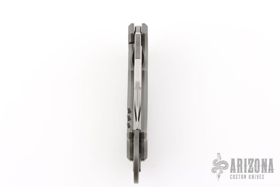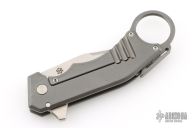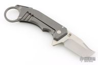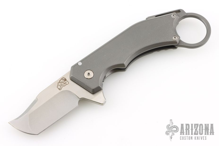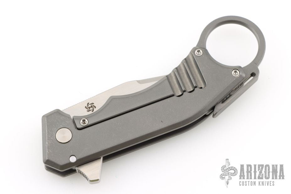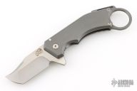 This Production Ringed Rhino Flipper from Mechforce was designed by Jon Graham and features a two-tone rhino grind blade with satin finished flats, tumbled bevels, notched thumbrest, flipper tab, and swedge. The handle is comprised of a contoured tumble finish titanium frame over a floating titanium backspacer with 1.04" ring, and titanium tip up clip. Excellent action. Great blade seating, detent and lock up. Comes with a hard case, Dragoncut pouch. New from Maker!