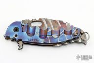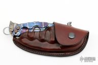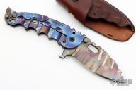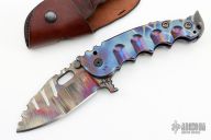 This Man of War flipper by TS Heeter features a multi-ground blade with notched thumbrest, thumbhole and flipper. The handle has an anodized titanium frame with tip up reversible titanium clip, black oxide finished 3V steel backspacer. Comes with a custom brown leather belt sheath. Nice detent, lockup and blade seating. Has a couple light scratches, otherwise excellent condition.
