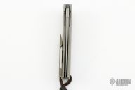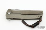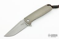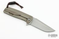 This Ronin from Mr. Curry features a tumble finished blade with false top edge and flipper. The handle is constructed of tumbled titanium with a matching pocket clip is positioned for tip up carry. Blade is centered when closed and locks up with no play. Has a couple light scuffs, otherwise excellent condition.