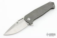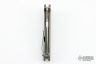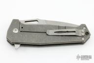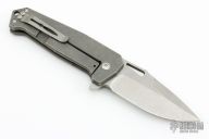 This Hitman from Jim Burke features a tumble finished blade with swedge and notched thumb ramp. The handle is comprised of a tumbled titanium frame over barrel spacers. Titanium tip up pocket clip. Excellent condition. Rides on bearings, nice lockup and blade seating. Comes with zippered case.