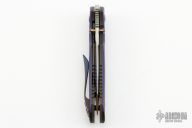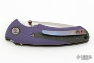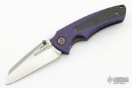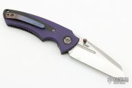 This Metronaught by Shane Sibert features a satin finished blade with swedge, fullers, notched thumbrest and dual thumbstuds. The handle has purple G-10 scales with carbon fiber inlays and pivot collars, anodized titaniun liners, anodized titanium hardware and tip up clip. Includes zippered case and COA dated 9-2017. Excelent condition.