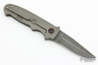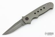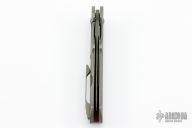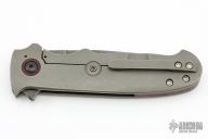 This New York Special by Chad Nell features a dark tumble finished clip point blade with swedge and flipper. The handle is comprised of a drilled and tumbled titanium frame with maroon canvas micarta backspacer and pivot collar, titanium over travel stop and titanium tip up clip. Excellent condition with great blade seating, detent and lock up. Includes patch and padded/zippered case.