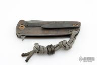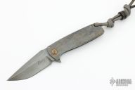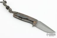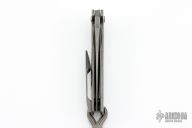 This Micro flipper from Mr. Tim Curry features an acid tumble finished blade with false top edge and flipper. The handle has an orange peel finished and anodized titanium frame with a zirconium pocket clip that is positioned for tip up carry. Blade is centered when closed, nice detent and locks up with no play, rides on bearings. Excellent condition.