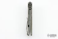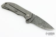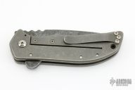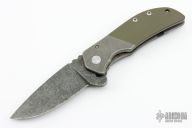 This El Patron Framelock Flipper has a dark acid washed drop point blade with flipper and notched thumbrest. Handle has stonewashed titanium frame with green G-10 A-side scale, lanyard hole, and stonewashed titanium tip up clip. Nice detent, lockup and blade seating. Comes with a zippered case. Has some scuffs, scratches and oxidation on the blade, otherwise good user condition.