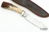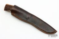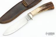 This Semi-Skinner by Master Smith Harvey Dean features a hand rub satin finished blade with notched thumbrest, .164" blade stock and 1.249" blade depth, hidden tang construction. The handle has a nickel silver guard, stag grip, red/nickel silver spacers. Comes with a brown leather sheath. Has some scratches and patina, otherwise good condition.