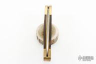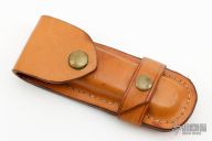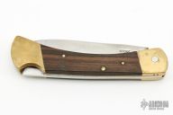 This lockback from G.W. Stone features a satin finish blade, the handle has brass frames with pinned wood inlays and stainless steel rockerbar. Comes with leather belt sheath. Has scuffs and scratches throughout. Good condition.