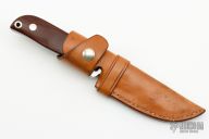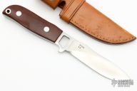 This knife by GW Stone features a satin finished blade with notched thumbrest, full tang construction with .187" stock with a depth of .95".  The handle has maroon linen micarta scales with stainless pins. Comes with a brown leather sheath. Has scuffs and scratches throughout. Good condition.