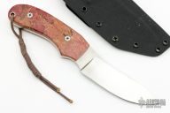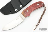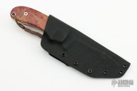 This knife by Bob Doggett features a hand rub satin finished blade with .189" blade stock and .97" blade depth, full tang construction with burl scales. Comes with a black kydex belt sheath. Has some scuffs and scratches, and a chip in the scale. Good condition otherwise.