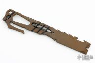 The Ti-Pry is multi-purpose pocket tool from Thompson Knife and Tool is made entirely of 3/8" titanium. This piece features a pry tip with nail puller, a nearly sharpened bottom edge, Also incorporated into the piece is a bottle opener, integral pocket clip, multiple hex bit openings, 2 Phillips 8-10 flat head double ended bit (secured by o-rings), and slotted cut out to fit various sized bolt heads. New from maker with COA.