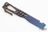 The Ti-Pry is multi-purpose pocket tool from Thompson Knife and Tool is made entirely of 3/8" titanium. This piece features a pry tip with nail puller, a nearly sharpened bottom edge, Also incorporated into the piece is a bottle opener, integral pocket clip, multiple hex bit openings, 2 Phillips 8-10 flat head double ended bit (secured by o-rings), and slotted cut out to fit various sized bolt heads. New from maker with COA.