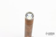 The Bolt Light is a special collaboration between Brian Fellhoelter, Tuff-Writer and FOURSEVENS, with a unique and innovative user-interface. While most flashlights rely on a traditional push-button switch, the Bolt Light uses a sliding bolt mechanism, allowing you to turn the light on and off, or change modes, with an easy and natural swiping motion. With three brightness levels and four special output modes, the Bolt Light is versatile enough to meet the needs of a variety of situations. DIMENSIONS Length: 5.83 inches Diameter: 0.71 inches Weight (without batteries): 2.7 oz LED EMITTER CREE XM-L2 VOLTAGE RANGE 2.7V -8.4V BRIGHTNESS LEVELS Low: 59 lumens, 8 hrs High: 490 lumens, 1.2 hours Strobe: 490 lumens, 2.4 hours SPECIAL MODES S.O.S.: 6 hrs Beacon (High): 15 hours Beacon (Low): 23 hours Moonlight: 1 lumen, 102 hours REFLECTOR. The body is tumbled copper. Excellent Condition. Battery is not included.