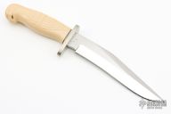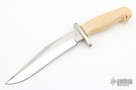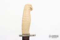 This Walker-Thornton Eagle by Robert Rippy was co-designed by Gregory Walker. It has a mirror polished blade with hand rub satin finished flats, false top edge, .249" blade stock and 1.327" blade depth, hidden tang construction. The handle has a nickel silver guard, red/white/black spacers, ivory paper micarta grip that was carved by Robert's wife Bonnie Rippy. Comes with a wooden presentation box with brass plaque that says "WALKER-THORNTON EAGLE Carved Especially For The Robert Rippy Collection by Bonnie Rippy 1991 1of1". Marked "0" on the blade. Excellent condition.